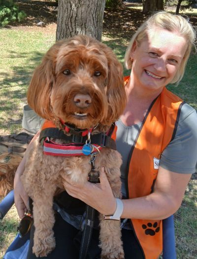 Jan and 'Sophie' help children at St John Vianney's Primary School, Parkdale.