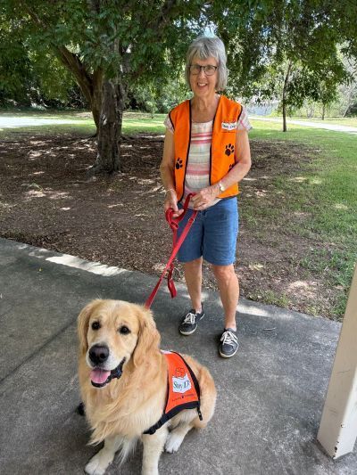Gayle and 'Murphy' help children at St John Vianey's Primary School, Manly